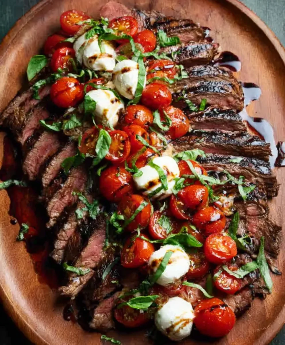 Now, it’s time to bring it all together. Arrange the thinly sliced flank steak on a serving platter. Drizzle the reserved balsamic marinade (the one you set aside earlier) over the steak. This reserved marinade will act as a light dressing, adding another layer of balsamic goodness. Spoon the Caprese topping generously over the sliced steak. The vibrant colors of the tomatoes and basil, coupled with the white mozzarella, create a visually stunning presentation. Serve immediately and enjoy the harmonious blend of grilled steak, tangy balsamic, and fresh, classic Italian flavors.
