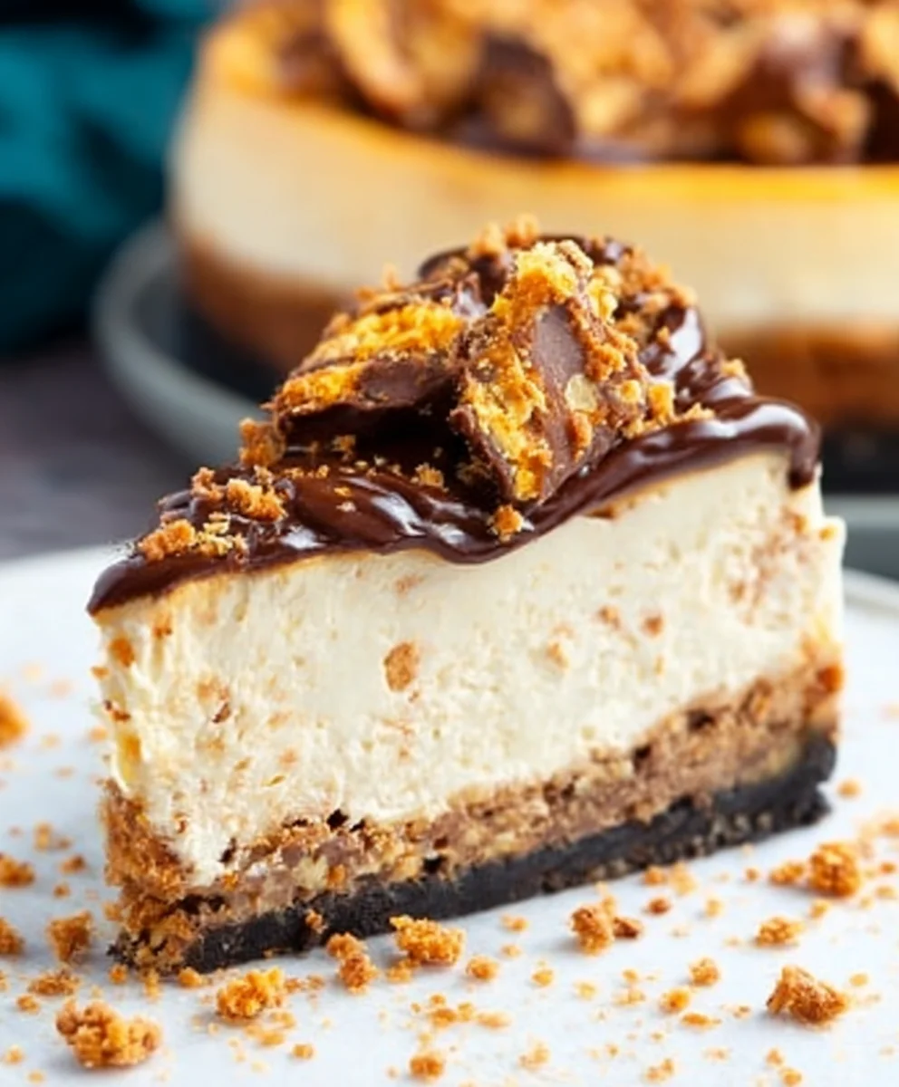 A decadent cheesecake recipe featuring a chocolate cookie crust, creamy peanut butter cheesecake filling, and a delightful Butterfinger and chocolate ganache topping.