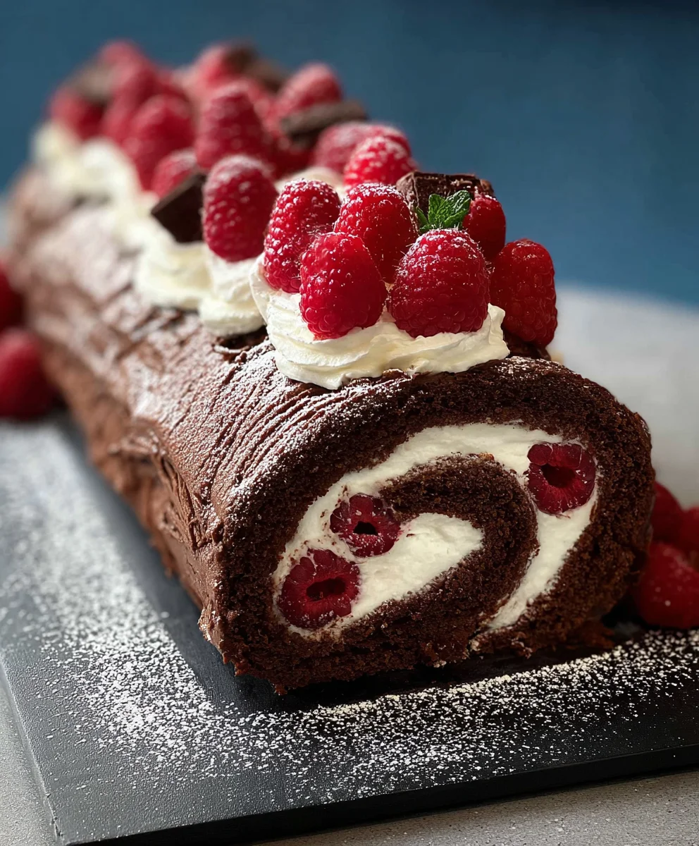 A light and airy chocolate sponge cake rolled with fresh raspberries and cream, creating a decadent dessert.