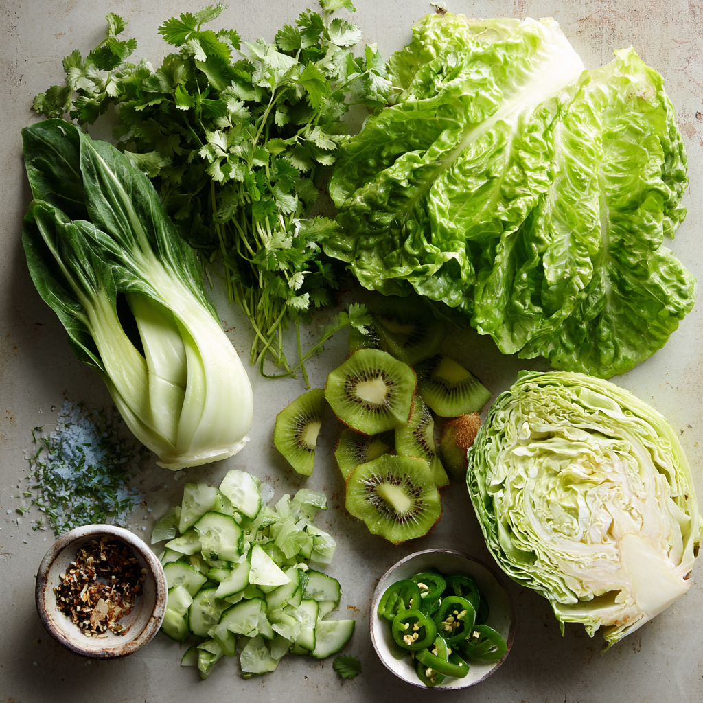 - Combine Salad Ingredients: In a large bowl, combine the shredded lettuce, watercress, cilantro, cucumber, bok choy, and Chinese cabbage. If using, add the sliced kiwi.