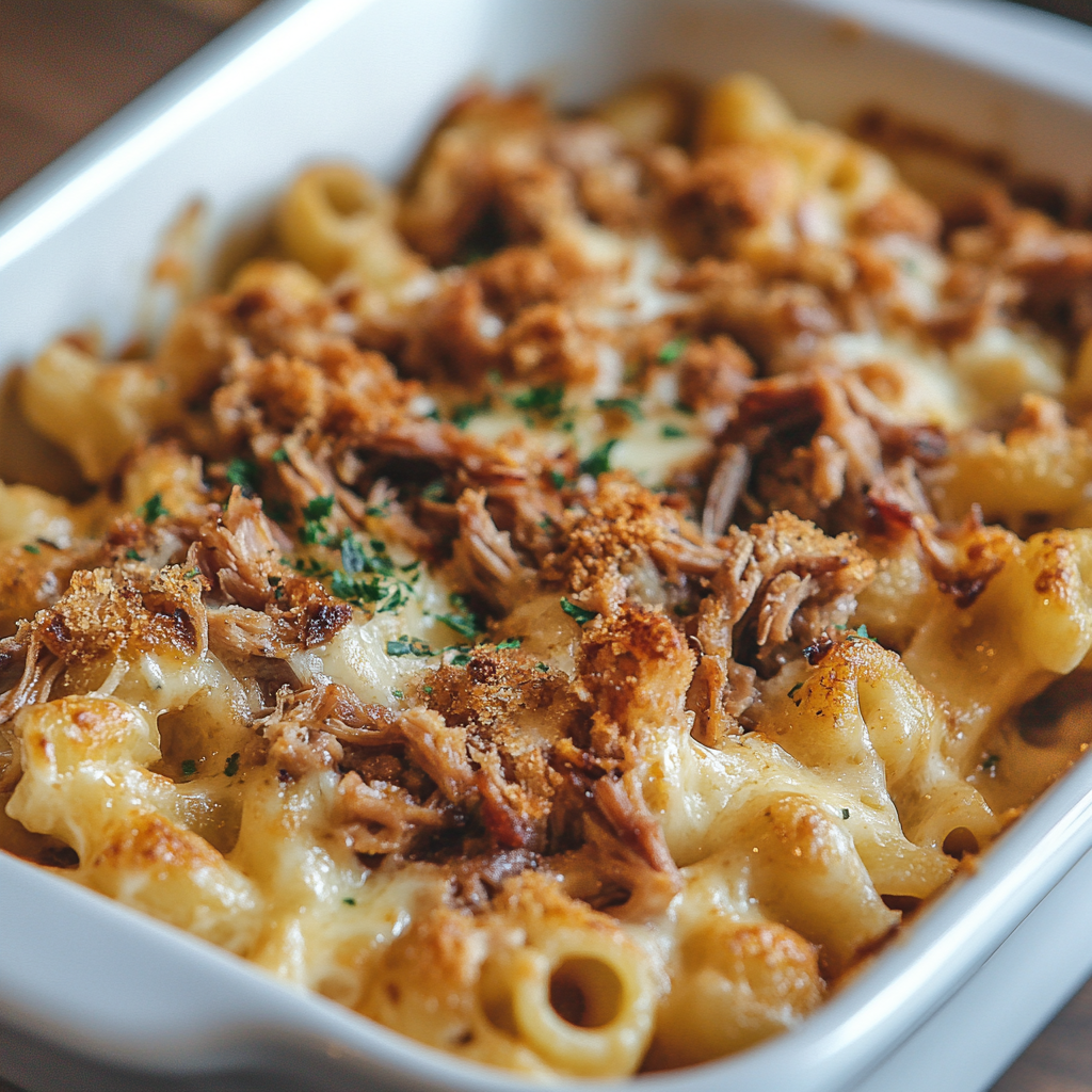 - Layer the Dish: In a large baking dish, spread half of the mac and cheese mixture. Top with half of the pulled pork, then add the remaining mac and cheese. Finish with the rest of the pulled pork on top. Photo Location: The layered mac and cheese and pulled pork in a baking dish.